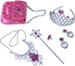 Krásna korunka s náušnicami, náhrdelníkom, prútikom a kabelkou. Doplnky sú zdobené ružovými prvky. Perfektná sada ku kostýmu!