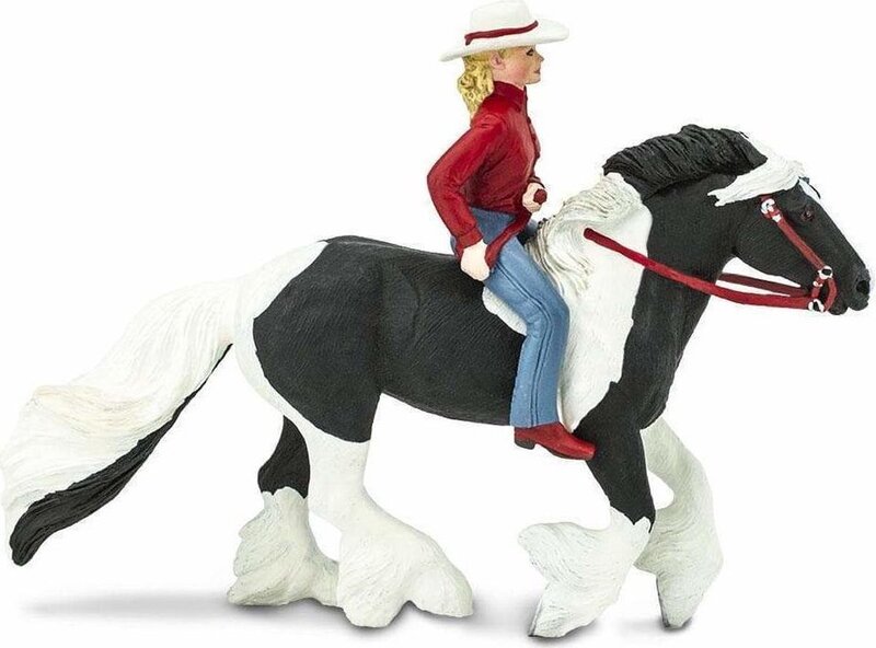 Veľkosť a farba: Streaming Light je čierno-biely Gypsy Vanner, merajúci 4 3 palca (cca 12 cm) na dĺžku, zatiaľ čo odnímateľná jazdkyňa s červenými akcentmi meria 3 palce (cca 7,6 cm) na výšku.