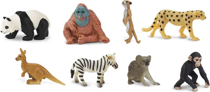 V balíčku nájdete: Pandu, Orangutana, Surikatu, Geparda, Kenguru, Zebru, Koalu a Šimpanza.
