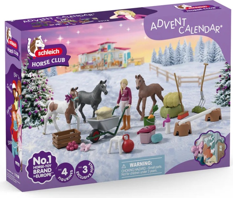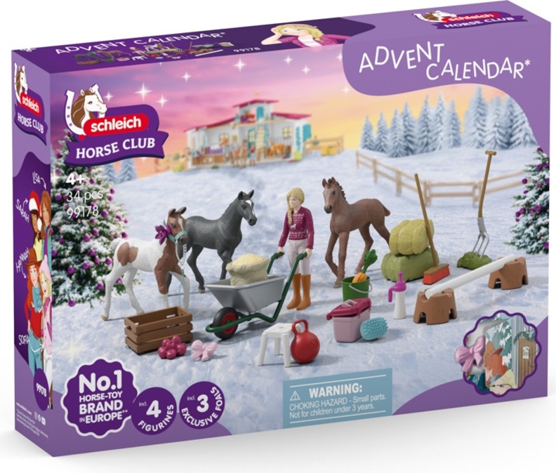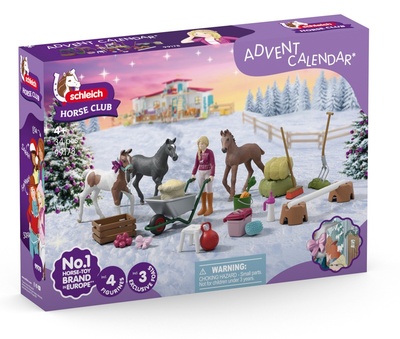 Adventný kalendár obsahuje tri žriebätá (holštajnske, hannoverské, frízske), figúrku Sarah s príslušenstvom na kŕmenie, starostlivosť a hru, vrátane krmiva, náradia, ozdôb a prekážok. Adventný kalendár Schleich® patrí do tematického sveta HORSE CLUB a je vhodný pre deti od 4 rokov.