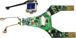 Náhradná elektronika do dráhového modelu auta SCX F-1 obsahuje dosku s elektronikou a cievku s jadrom a tiahlom na radenie. Cievka sa nacvakne do prednej časti dosky elektroniky.