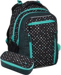 Čierno-tyrkysový peračník pre malé školáčky. Na dvojitej priehradke sú gumové pútka na písacie potreby, ďalšie pomôcky sa zmestia do priestoru pod priehradkou. Zapína sa pohodlne zipsom s jedným ťaháčikom.