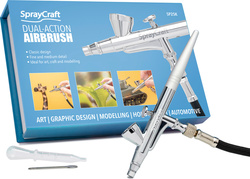 Charakteristika: Spraycraft airbrush profesionálna dvojčinná striekacia pištoľ SP45, kedy sa stlačením spúšte uvoľní vzduch a spätným pohybom sa uvoľní farba. Trojica výmenných nádobiek (2 ccm, 7 ccm a 12 ccm) s vrchným plnením farby, 3 sady trysiek (0,2 mm, 0,3 mm a 0,5 mm). Pištoľ ďalej obsahuje skrutku na doladenie prúdu vzduchu a skrutku na obmedzenie maximálneho množstva dávkovanej farby. Pre profesionálov Art, umenie a grafiku. Závit na šróbenie hadice so závitom G1/8". Vynikajúci pre veľmi jemné detaily, vyvážené telo pištole, dobre sa drží. Na sprevádzkovanie budete potrebovať bezolejový kompresor s tlakovou nádobkou, regulátorom tlaku a filtrom tlakového vzduchu. Táto profesionálna sada airbrush je navrhnutá tak, aby zvládla akúkoľvek úlohu, preto má nadštandardné vybavenie príslušenstvom, s tromi sadami trysiek, ihiel a tromi výmennými nádobkami si ľahko poradí so širokým spektrom techník aj s jemnými detailmi. Je možné použiť atramenty v spreji, vodové farby, farbivá, akryly, vodou riediteľné laky a emaily. Vlastnosti Pohodlné a dobre vyvážené telo pištole Dvojčinná funkcia ovládania Vrchné plnenie 3 druhy trysiek 3 druhy ihiel 3 nádobky na farbu Nastaviteľné množstvo vzduch Nastavenie maximálneho množstva farby Kolekcia SHESTO Modelcraft V kolekcii SHESTO Modelcraft sa nachádza komplexný rad užitočných špeciálnych, často ťažko dostupných presných ručných nástrojov a príslušenstva, potrebných na presnú prácu. Rad nástrojov Modelcraft je určený tam, kde je potrebné pracovať s drobnými dielmi, ako sú modely, elektronika či iné remeslá. Vysvetlivka - rozdiel medzi jednočinnou a dvojčinnou pištoľou Shesto SprayCraft ponúka striekacie pištole pre začiatočníkov i pokročilých, jednočinné aj dvojčinné. Tieto pištole nachádzajú uplatnenie pri vytváraní dekorácií, v aranžérstve, umeleckej tvorbe alebo v modelárstve a rôznych technických prácach. Preto je ich ponuka pomerne široká a ponúka sa pištoľ pre začínajúcu a skúsenejšiu obsluhu, jednoduchšie práce i náročné profesionálne aplikácie. Prakticky každý si môže dnes nájsť pištoľ na airbrush na daný účel použitia. Funkcia jednoduchej jednočinnej pištole Jednočinné pištole pracujú na princípe fixírky. Farba je nasávaná podtlakom rýchlo prúdiaceho vzduchu za tryskou, kde je zmiešaná so vzduchom a prenesená na farbenú plochu. Jednočinné pištole Jednočinné pištole sa vyznačujú jednoduchou konštrukciou a jednoduchou obsluhou, čo je výhodou, pretože s ňou môžu pracovať aj deti a neskúsení. Pretože farba je privádzaná iba k tryske, je čistenie a výmena za inú farbu rýchla. Pištoľ nemá reguláciu, možno ju preto využiť na väčšie plochy. Funce jednoduchej dvojčinnej pištole Dvojčinná pištoľ má oddelené dávkovanie vzduchu a farby. Stlačením spúšte sa pridáva vzduch, ťahaním vzad sa otvára tryska, dozadu zaťahuje ihla, čím sa pridáva množstvo farby. Dvojčinné pištole Dvojčinná pištoľ má zložitejšiu konštrukciu, spravidla ide o kovový odliatok s množstvom dielov. Plnenie farbou sú spravidla spodné, bočné a horné a tomu zodpovedá aj tvar a konštrukcia pištole. Tá máva pre pohodlné držanie tvar ceruzky, vďaka tomu je možné presne dávkovať a smerovať prúd nástreku. Je možné meniť veľkosť trysky od cca 0,2 do 0,5mm. Obsah balenia: V balení je Spraycraft airbrush dvojčinná striekacia pištoľ SP45, tryska (0,2, 0,3 a 0,5 mm), ihla (0,2, 0,3 a 0,5 mm), nádobky (2 ml, 7ml, 12 ml s viečkom), kľúč na trysku, tlaková hadica 1,8 m, adaptér 1/4”- 1/8” BSP, návod na použitie SK, EN, GB, FR, IT.