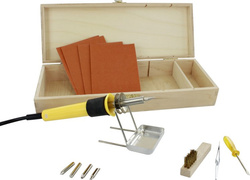 Základná pyrografická sada na vypaľovanie obrazcov do mäkkého dreva, kože a podobných vhodných materiálov. Celkom 11 dielna sada obsahuje pyrografickú (vypaľovaciu) spájku, stojan, sadu rôznych vypaľovacích nástavcov, čistiacu kefku s papierikmi, pinzetu a skrutkovač.