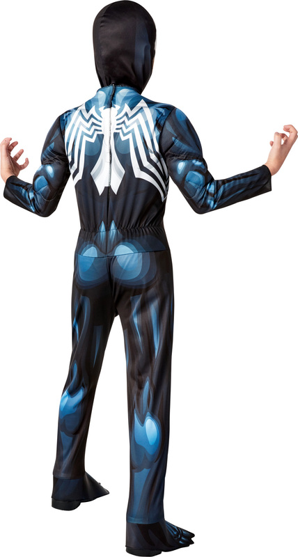 Nech nastane masaker! Uvoľnite obľúbenú mimozemskú symbiotickú formu života v tomto zlom deluxe detskom kostýme Marvel Venom. Anti-hrdina nikdy nevyzeral tak dobre vo vypchatej kombinéze s pripevnenými návlekmi na topánky a látkovou maskou.