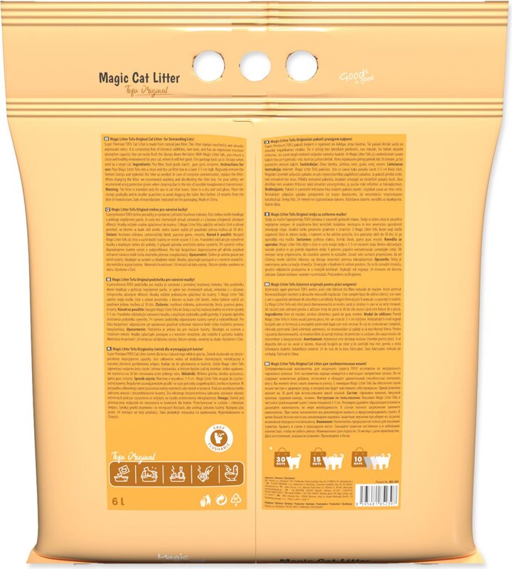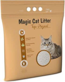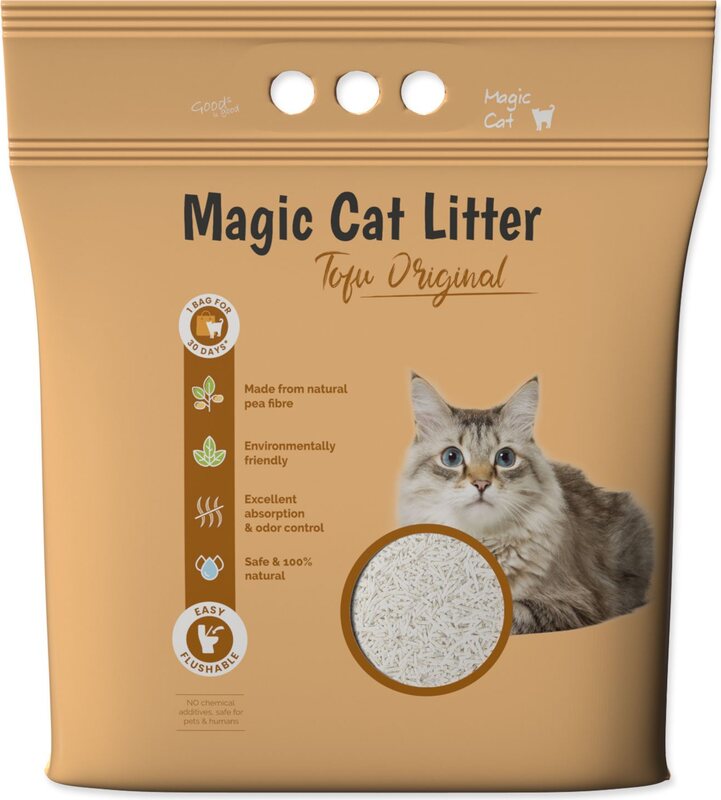Je úplne bez chemických prísad, netoxické a s úžasnou schopnosťou absorpcie vlhkosti. Hrudky môžete jednoducho spláchnuť do toalety. S Magic Litter Tofu zaistíte svojej mačke čisté a zdravé prostredie, v ktorom sa bude cítiť skvele. Jedno balenie vydrží pri používaní jednou mačkou až 30 dní.