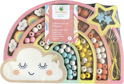 Drevené pastelové koráliky uložené v krabičke v tvare dúhy sú krásny darček pre deti od 3 rokov. Navliekanie korálikov napomáha rozvoju jemnej motoriky, koordinácii ruky a oka a navyše vyžaduje trpezlivosť a sústredenie sa na danú vec.