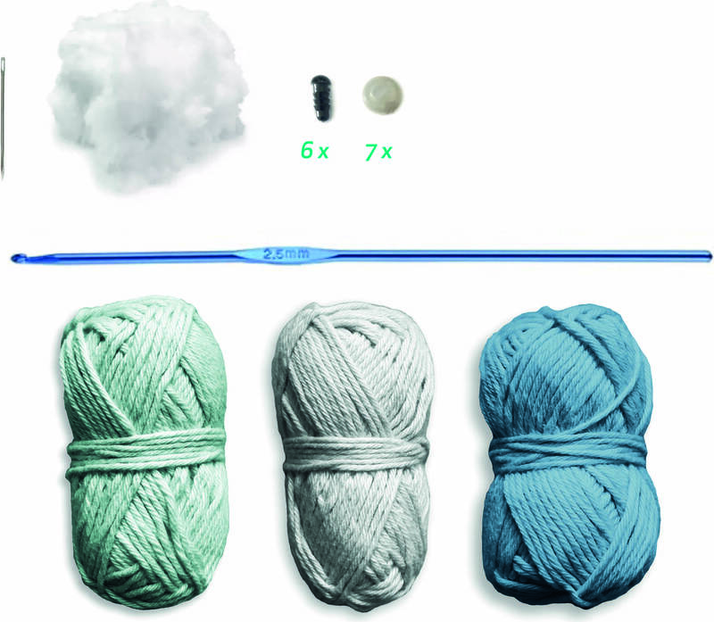 Obsah sady: Bavlnená priadza – modrá (10 g), biela (20 g), morská zelená (10 g), 6 plastových očiek a 1 plastový nos, veľká ihla, výplň, háčik na háčkovanie (2,5 mm), Ilustrovaný sprievodca krok za krokom. Rozmery balenia: 17 × 4 × 16 cm.