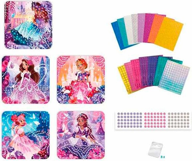 Obsah balenia: 5 obrázkov na pevnom kartóne 24 x 24 cm, 1500 mozaikových dielikov a trblietavých kamienkov, 5x priehľadný záves a farebný návod krok za krokom.