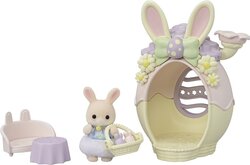 Sada Sylvanian Families - Veľkonočné vajíčko s králikom obsahuje domček s veľkými králičím ušami na streche, ozdobený jarnými kvetmi. V domčeku sa nachádza pohovka a stolček.