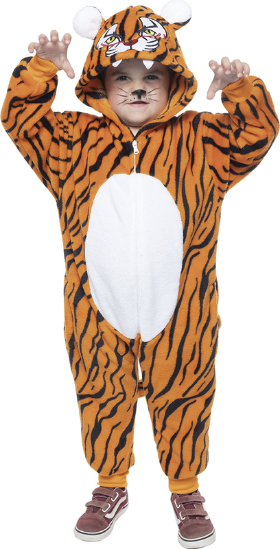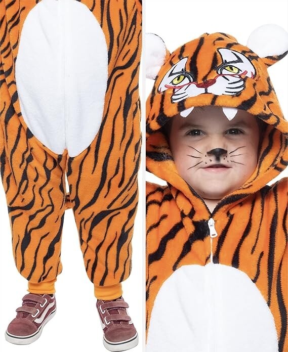 Kostým Tigra od Rubies pre chlapcov a dievčatá, Unisex, Pohodlná a zábavná tigria kombinéza s kapucňou v tvare tigrej hlavy a chvostom, Originál Rubies, Ideálne na Halloween, Vianoce, karneval a narodeniny.