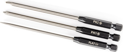 Náhradné drieky 1/4" do Traxxas skrutkovača s rúčkou Premium alebo do akuskrutkovačov, s koncovkou skrutkovač plochý 3 mm, krížový PH1 a PH2. Drieky sú vyrobené z kvalitnej HSS ocele.
