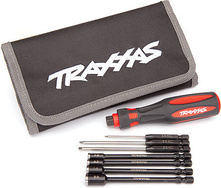 Traxxas skrutkovač s výmennými bitmi (sada Essential) obsahuje rúčku Premium s výmennými bitmi imbus 1.5, 2.0, 2.5 mm a bity nástrčné 5.0, 5.5, 7.0, 8.0 mm. Rukoväť je pogumovaná s priemerom 22 mm a dĺžkou 119 mm, dĺžka nástrčných bitov je 100 mm, dĺžka imbusu je 109.5 a 85 mm. Puzdro na náradie s vyšitým logom je na praktické uzatváranie suchým zipsom. Puzdro je v čiernom prevedení so šedým lemovaním, vyrobené z nepremokavej tkaniny.
