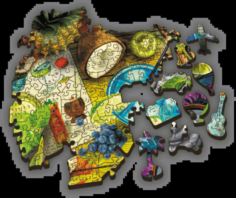 Vysoká kvalita a precízne spracovanie laserom, až 50 unikátne tvarovaných dielikov, ostatné dieliky v nepravidelných tvaroch, puzzle je obojstranné – z jednej strany obrázok, z druhej strany vzor.