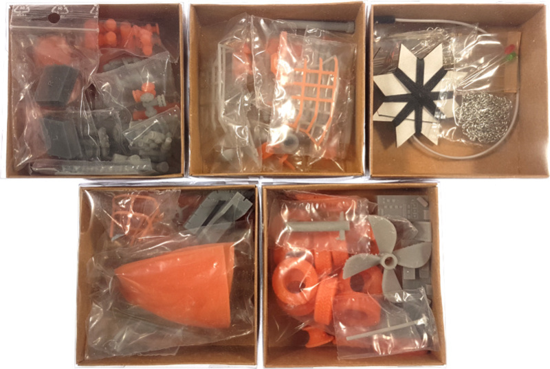 Po otvorení viečka krabice nájdete obsiahlu sadu drevených dielov modelu z preglejky, sadu lišt, súčasti 3D tisku v blistri, obrázkový návod.