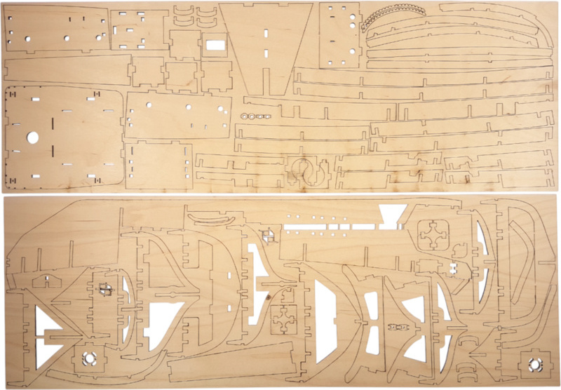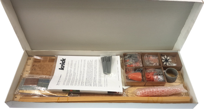 Balenie obsahuje diely na stavbu lode: diely z preglejky, lišty, laserom rezané drevené diely, maketové diely z 3D tisku, z plastu, kovu apod., samolepky, obrázkový manuál EN.