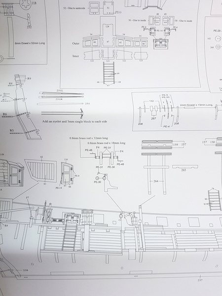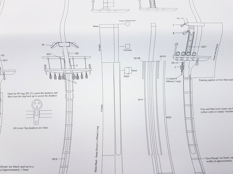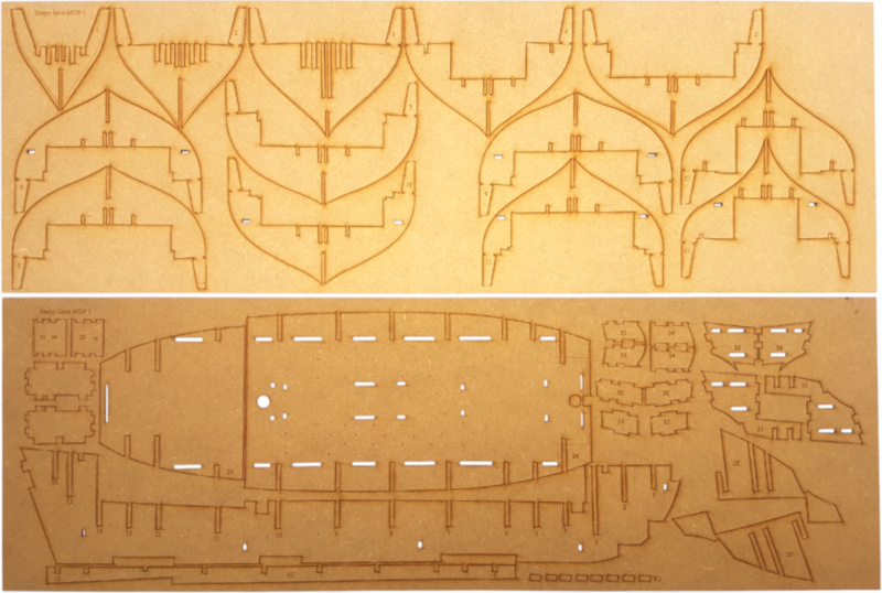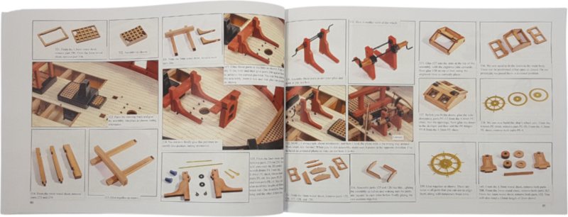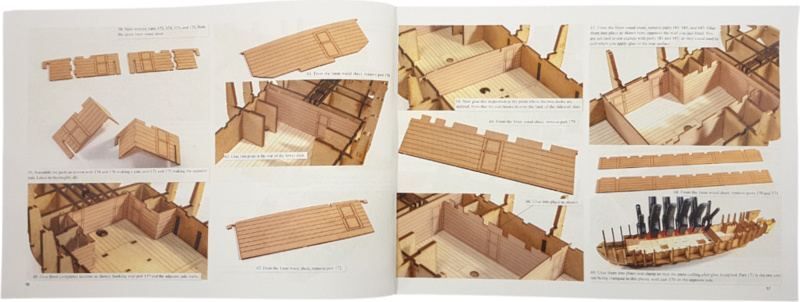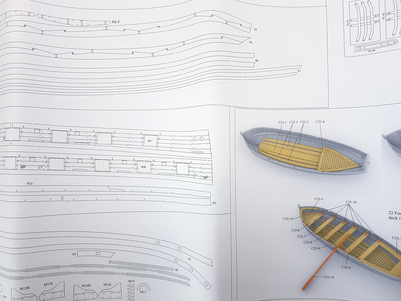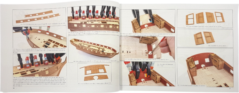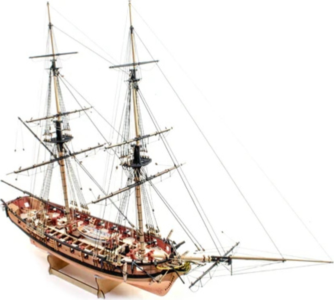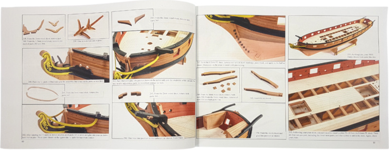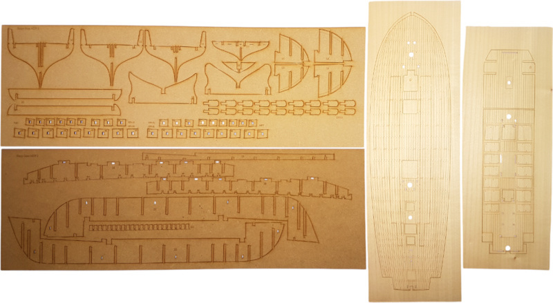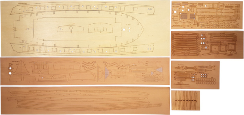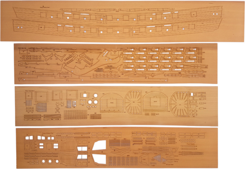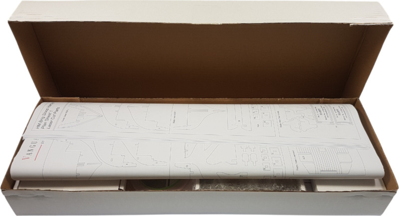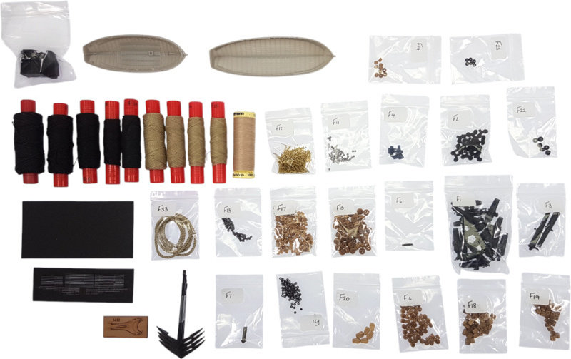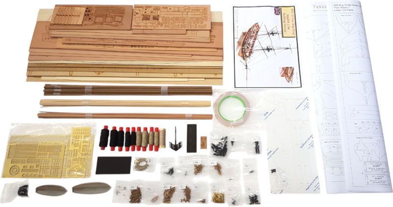 Balenie obsahuje laserom rezané a gravírované diely vyrobené z MDF a hruškového dreva, lišty z lipového a hruškového dreva (druhá obšívka), laserovo rezaná a gravírovaná paluba, 3 mosadzné dosky s fotoleptanými dielmi, stožiare, kladky, oka a lana na lanoví, komponenty zo dreva a 3D tlače. Komplexný, farebný návod k použitiu spolu s 16 výkresmi modelu v mierke a detailmi na formáte A1 - manuál EN.