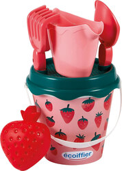 Toto vedro s výškou 17 cm je vybavené tmavozeleným sitkom, kanvičkou, ružovou lopatkou, hrablem a formičkou v tvare jahody: všetko potrebné na stavanie najkrajších hradov z piesku, zbieranie najkrajších pokladov alebo kopanie najimpozantnejších dier!