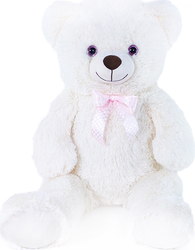 - Medveď vo veľkosti 78 cm je vyrobený z kvalitného hebučkého plyšu, má krémovo bielu farbu a krk mu zdobí ružová saténová mašľa.