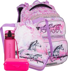 Jemný set s koníkmi pre malé školáčky od 1. do 3. triedy. Batoh je extra ľahký, pritom priestranný. Má dve veľké komory a dve praktické predné vrecká. Stojí na plastových nožičkách, v tme svietia reflexné prvky. Chrbtový systém s nastaviteľným hrudným pásom a odľahčeným vyberateľným bedrovým pásom má zdravotný posudok. K batohu bude školáčke ladiť peračník na písacie potreby a látkový vak na prezuvky alebo školský úbor.