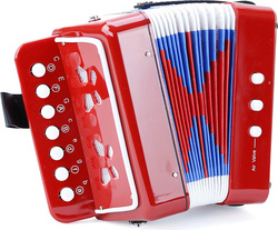Krásny modro-bielo-červený akordeón, ktorý Vaše deti uvedie do sveta hudby. Obsahuje desiatich klávesov a má 14 tónín.