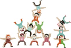 Dvanásť drevených figúrok akrobatov, s ktorými si môžete zahrať balančnú hru.