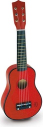 Klasická drevená akustická gitara so šiestimi strunami v tehlovej farbe. Gitara má natiahnuté nylonové struny.