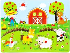 Drevená vkladačka so zvieratkami na farme, v ktorej si deti môžu skúsiť priradiť správne dieliky do pripravených výrezov.