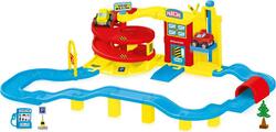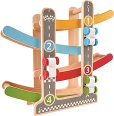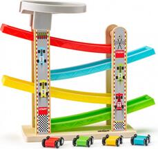 Hračka pre najmenších. Dieťa umiestni autíčka na hornú plochu dráhy, nakloní ju a autíčka zídu po dráhe dole.