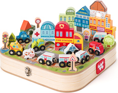 Kúzelný svet železníc v drevenom kufríku, ktorý sa po rozložení premení na úžasnú hraciu sadu pre malých objaviteľov.
