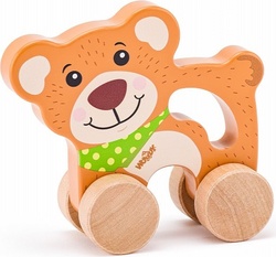 Drevená hračka na kolieskach s držadlom, ktorého tvar umožňuje detskej ruke pohodlný a pevný úchop.