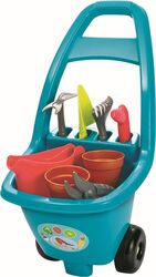 Záhradný vozík na kolieskach pre malých záhradníkov obsahuje všetko potrebné, napr. Kvetináče, krhličku, záhradné náradie.