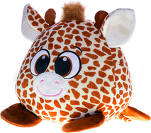 Okrúhla plyšová žirafa s veselým úsmevom.