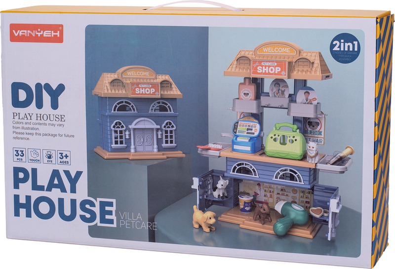 Dvojnásobná zábava! Otvor dvere do sveta starostlivosti a obchodu so zvieratkami! Deti sa môžu hrať na starostlivého ošetrovateľa v domčeku, alebo na predavača v obchode.
